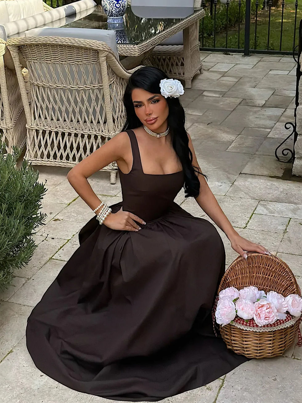 Ruda kvadratinės iškirptės ilga suknelė su dirželiais